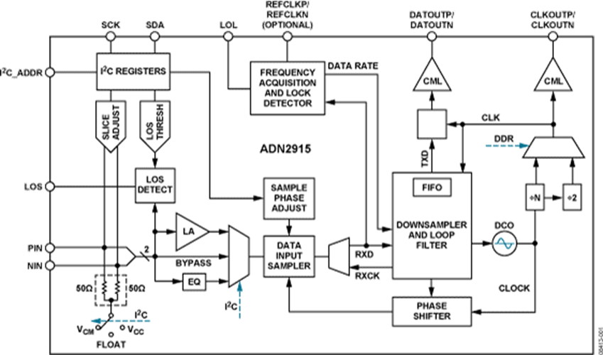 當輸入信號(hao)(hao)電(dian)平降至用戶可編(bian)程(cheng)閾(yu)值以(yi)下時(shi),接收器(qi)前端(duan)信號(hao)(hao)丟失(LOS)檢測電(dian)路(lu)會予(yu)以(yi)提示(shi)。LOS檢測電(dian)路(lu)具有遲滯特性,可防止LOS輸出震顫。此外,可通過I2C寄存器(qi)讀取輸入信號(hao)(hao)強度。